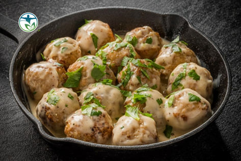 This recipe is a perfect, hearty, cold-weather dish that tastes amazing. The spices create a wonderful flavor to the meatballs, and the gravy is also very flavorful, rich and creamy. It would be delicious served over mashed cauliflower or with roasted winter squash on the side. You may want to double this recipe, as they are even better leftover for quick meals.