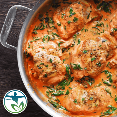 This recipe is so delicious. It takes very little time to make – yet is very satisfying with an easy-to-make creamy tomato and spinach sauce. We exchange the heavy cream usually found in this dish, for coconut cream. You can use marinara sauce in place of the tomato sauce for another depth of flavor. Muir Glen makes a product without sugar or artificial sweeteners in the healthy food department at Kroger. Serve with a side of cauliflower rice, roasted vegetables, or over spaghetti squash or zucchini noodles, and you have a very memorable meal.