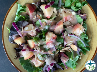 Don’t waste your peaches! Blend them into a vibrant peach vinaigrette to dress fresh greens and almonds for a light, flavorful salad that’s perfect for summer or any time of year.