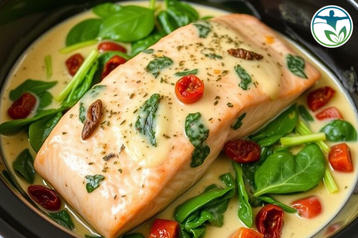 Bring restaurant-quality flavor to your table with this Slow Cooker Creamy Tuscan Salmon by Miriam Rees. Made with flaky salmon, sun-dried tomatoes, and spinach in a rich garlic-butter cream sauce, this Crockpot recipe is simple, satisfying, and perfectly balanced for a healthy lifestyle.
